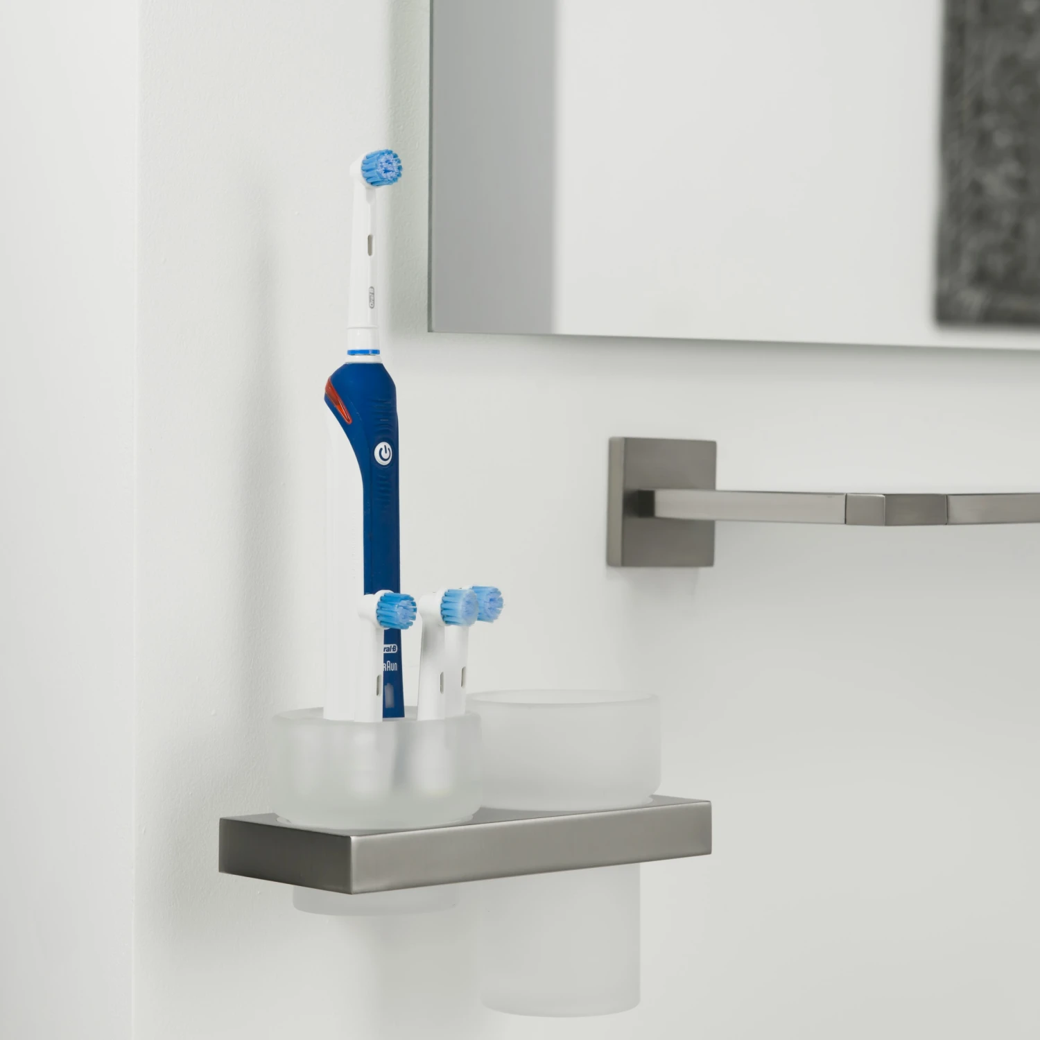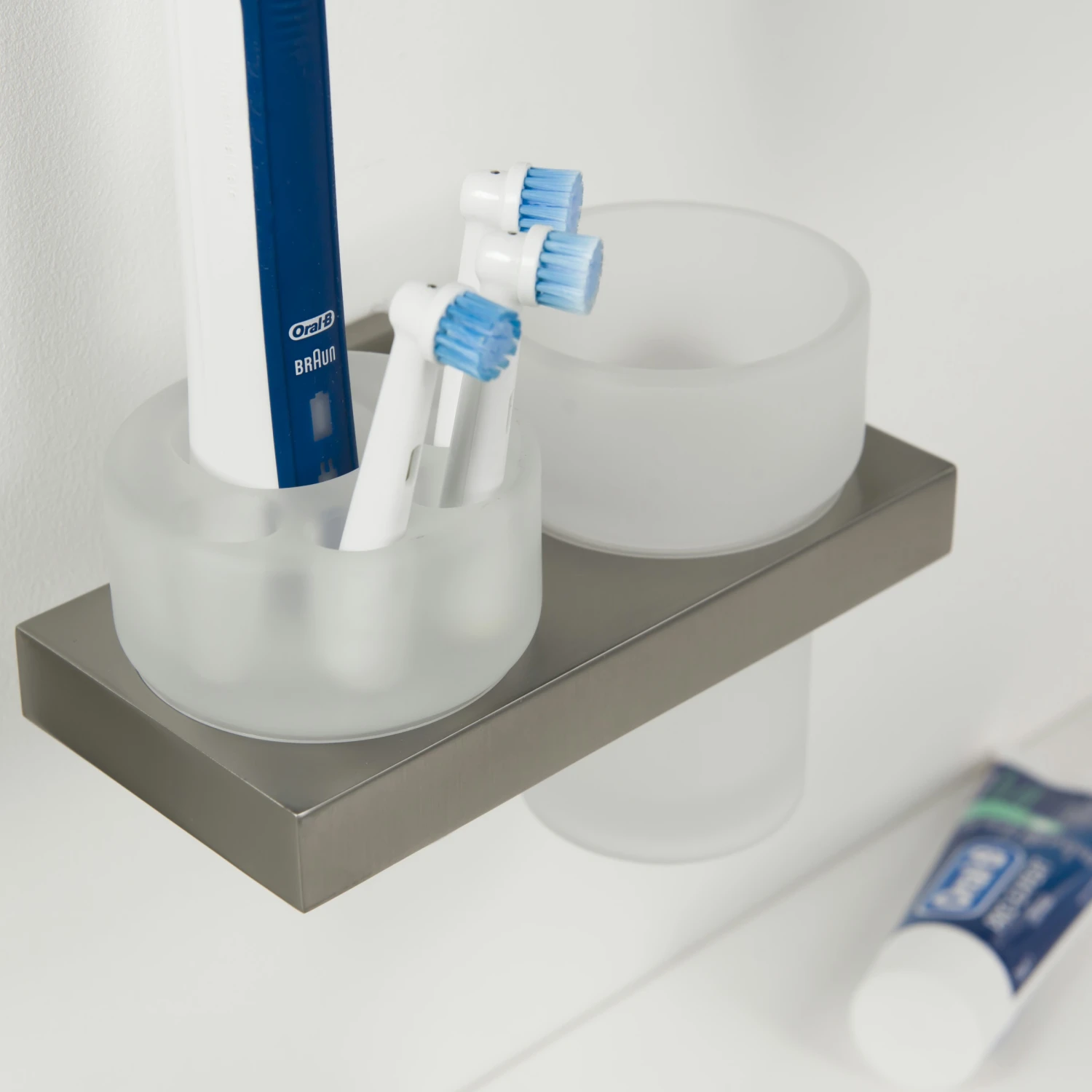 De Tiger Items beker-/tandenborstelhouder rvs van de accessoireserie Items is uitgevoerd in RVS gecombineerd met mat glas, en is ook verkrijgbaar in chroom. In de elektrische tandenborstelhouder past 1 Braun/Oral B elektrische tandenborstel, terwijl er ook ruimte is voor 4 losse borsteltjes. Dit product kan aan de wand worden geschroefd, maar kan ook met behulp van Tigerfix 1 op een gladde en harde ondergrond geplakt worden. Je hoeft dus niet te boren. (Tigerfix is los verkrijgbaar). Er zijn van deze serie diverse sanitair accessoires verkrijgbaar. Dit product maakt deel uit van het Items totaalconcept, dat verder bestaat uit kranen, badmeubelen, douche accessoires en douchecabines, alles in de Items stijl.